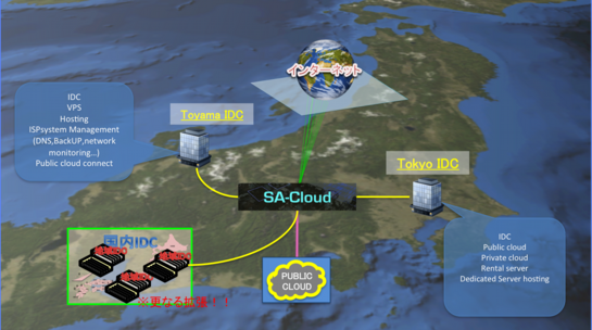 SA-Cloudのハウジングサービスは東京と北陸のデータセンターを運用することで既存システムとのリスクヘッジが大きな特色となっております。東京のデータセンターではネットワーク、ハウジングコストの低減を中心にハウジングサービスをコーディネイトし、地域型データセンターはリスク分散だけでなく、周辺地域生活を支える重要なインフラであることから、官民様々な需要を元にお客様のネットビジネスにフィードバック出来るよう、有効活用して参ります。